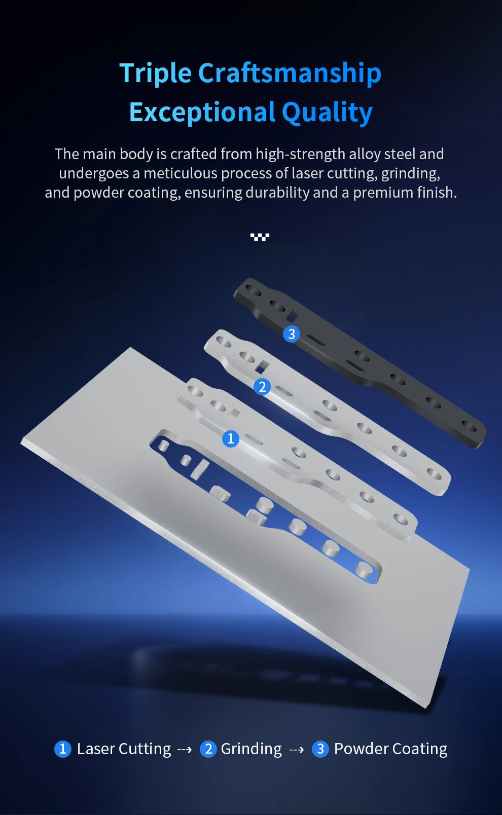 High-Strength Alloy Steel Body - The whole body uses high-strength alloy steel with laser cutting, grinding, powder coating, and other processes. It is wear-resistant, sturdy, and durable.